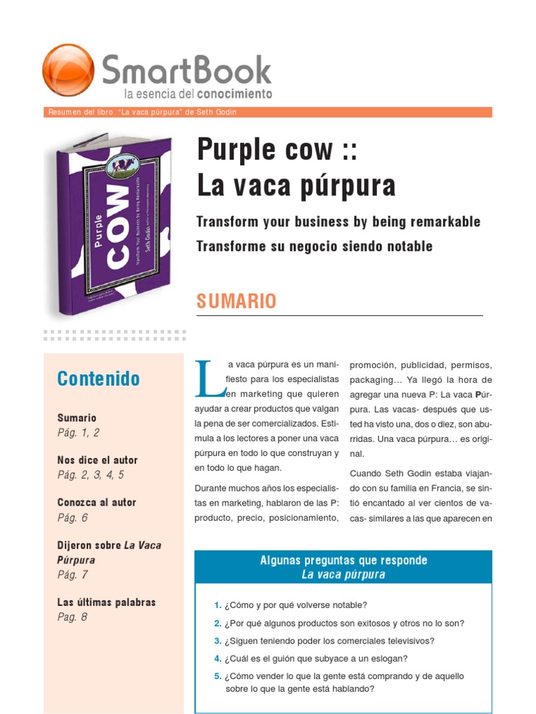 En el resumen de esta semana vamos a ver la vaca púrpura purple cow 2003 del gurú del marketing seth godin en el que vemos la nueva función del marketing. Diferénciate para transformar tu negocio, este libro se ha mantenido como una de las piezas sagradas para todo mercadologo y emprendedor. La vaca púrpura vendió más de 150.000 ejemplares en sus dos primeros años de publicación. Create html5 flipbook from pdf to view on iphone, ipad and android devices. La vaca púrpura pdf es uno de los libros de ccc revisados aquí.